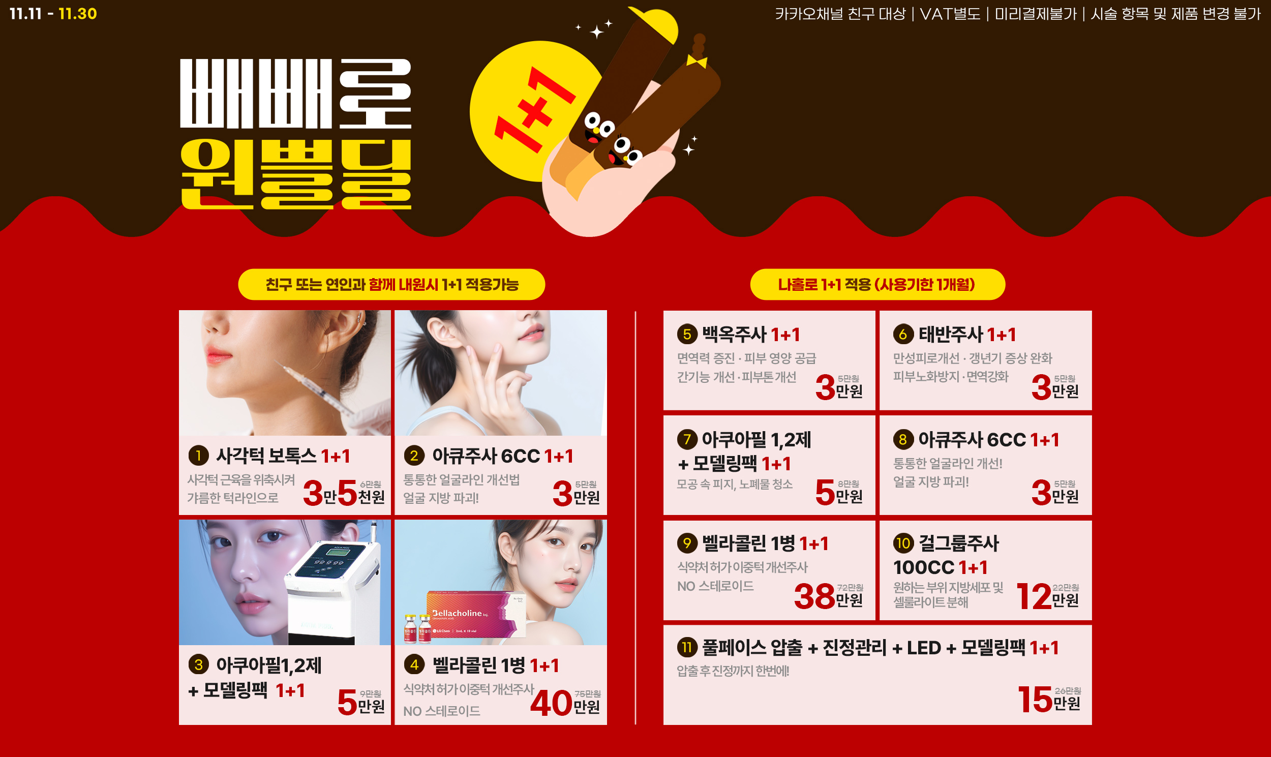 빼빼로데이 1+1 원쁠딜⚡ 카카오톡채널 친구대상 · VAT별도
