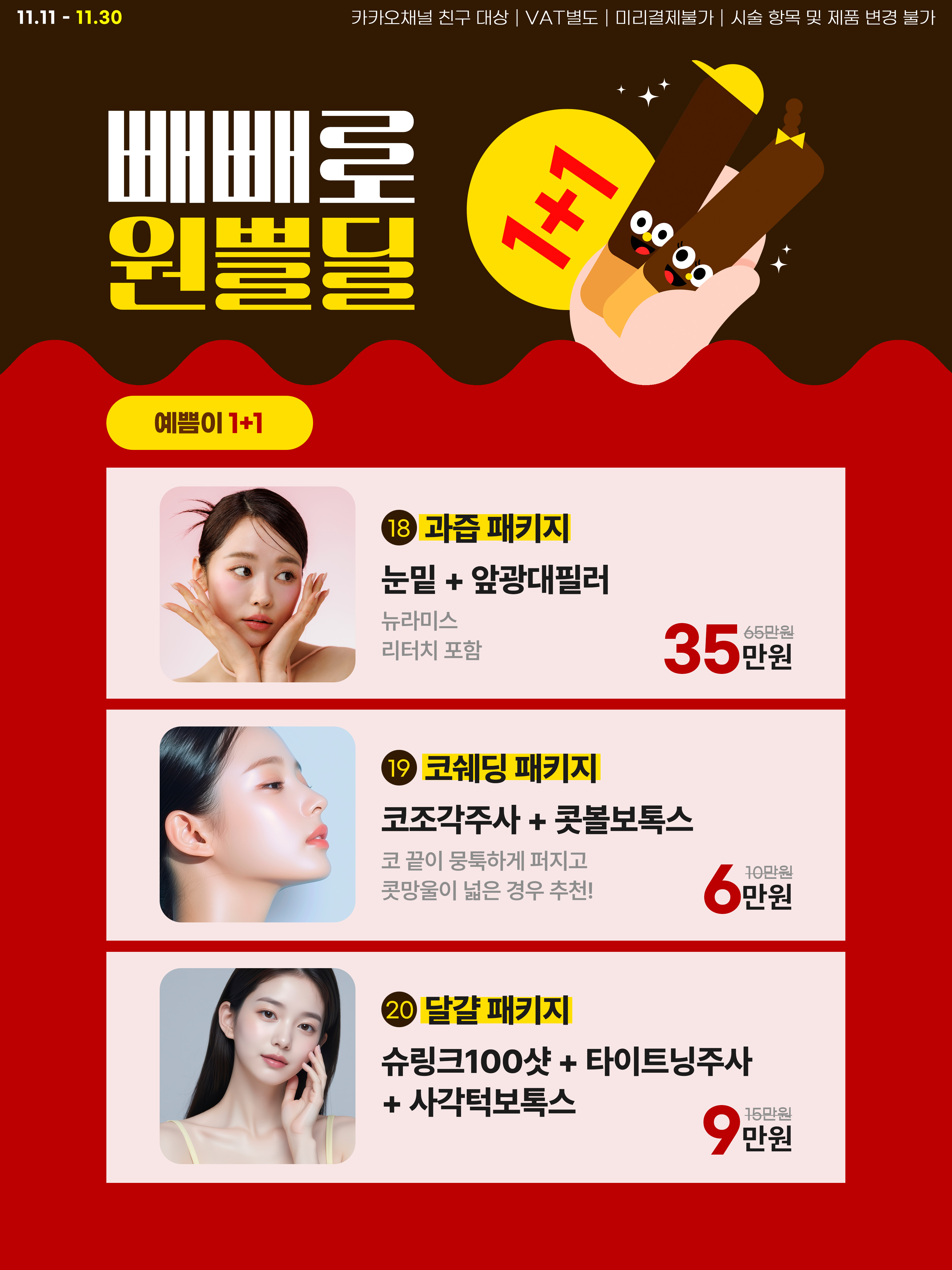 빼빼로데이 1+1 원쁠딜⚡ 카카오톡채널 친구대상 · VAT별도
